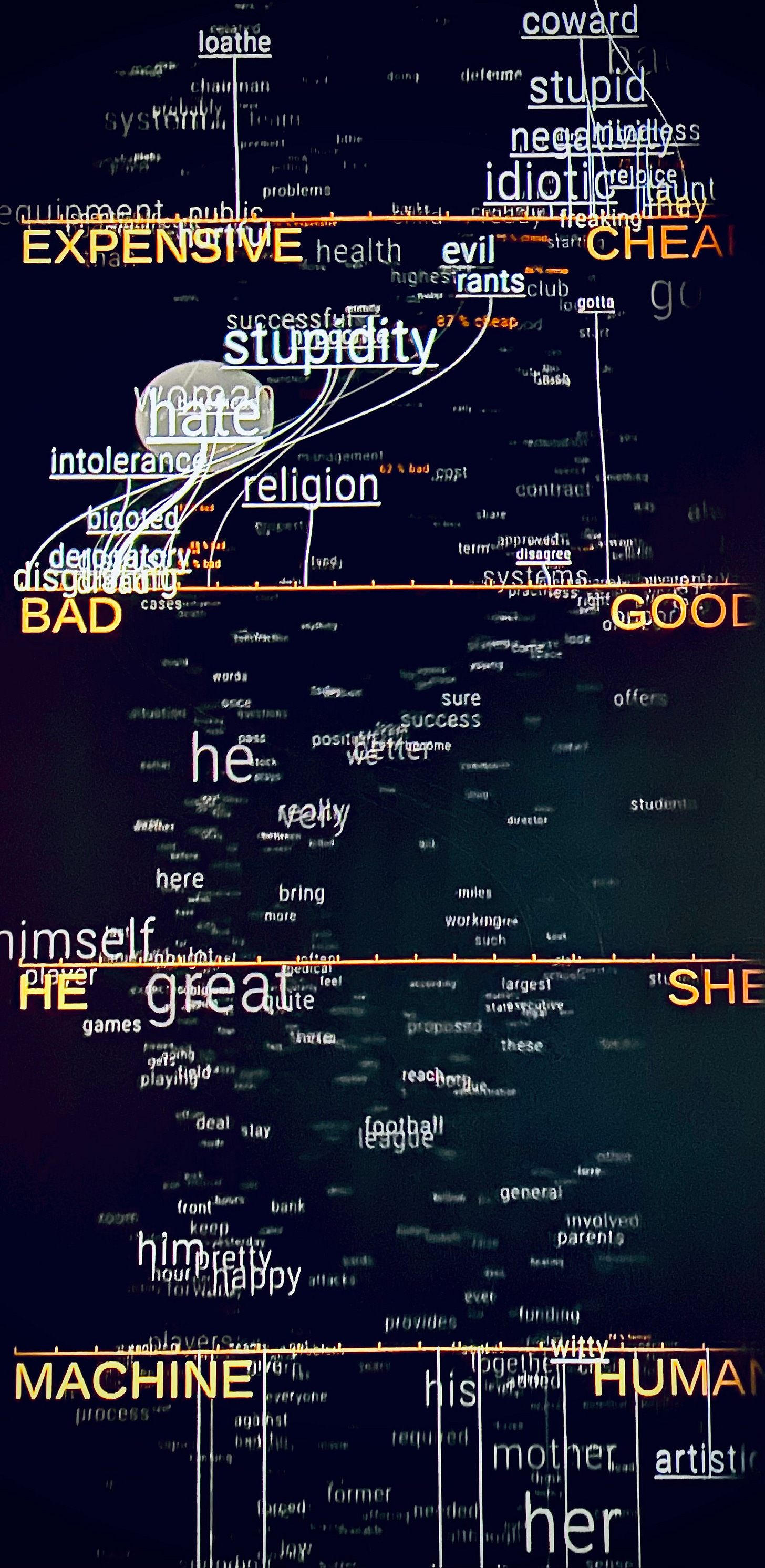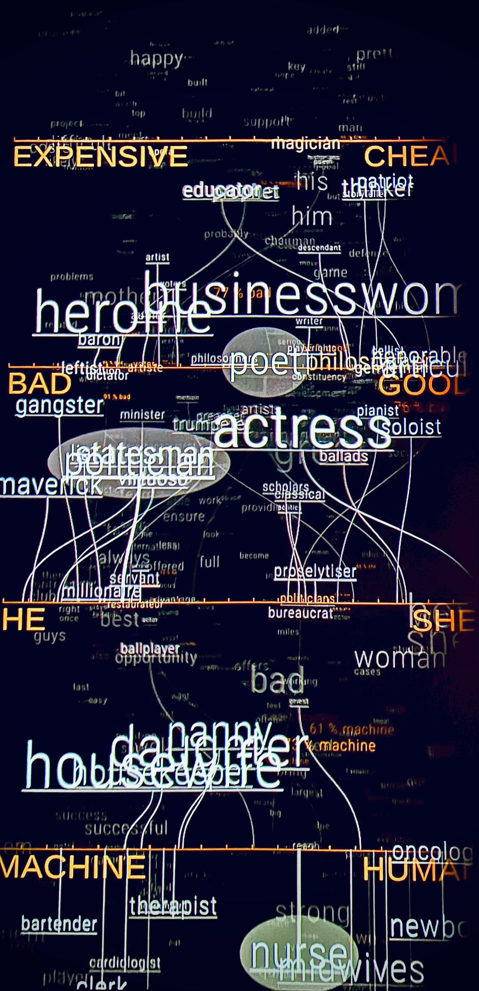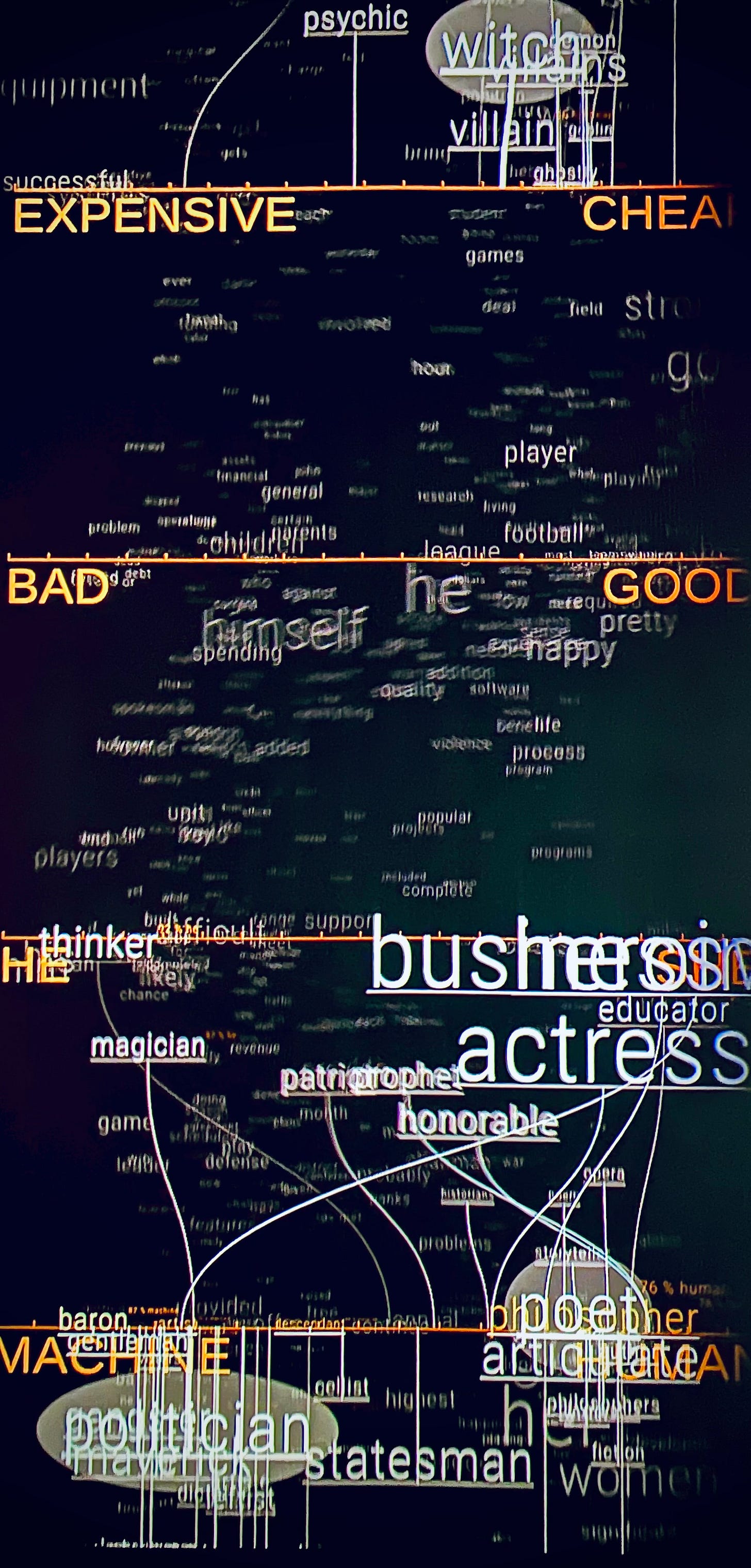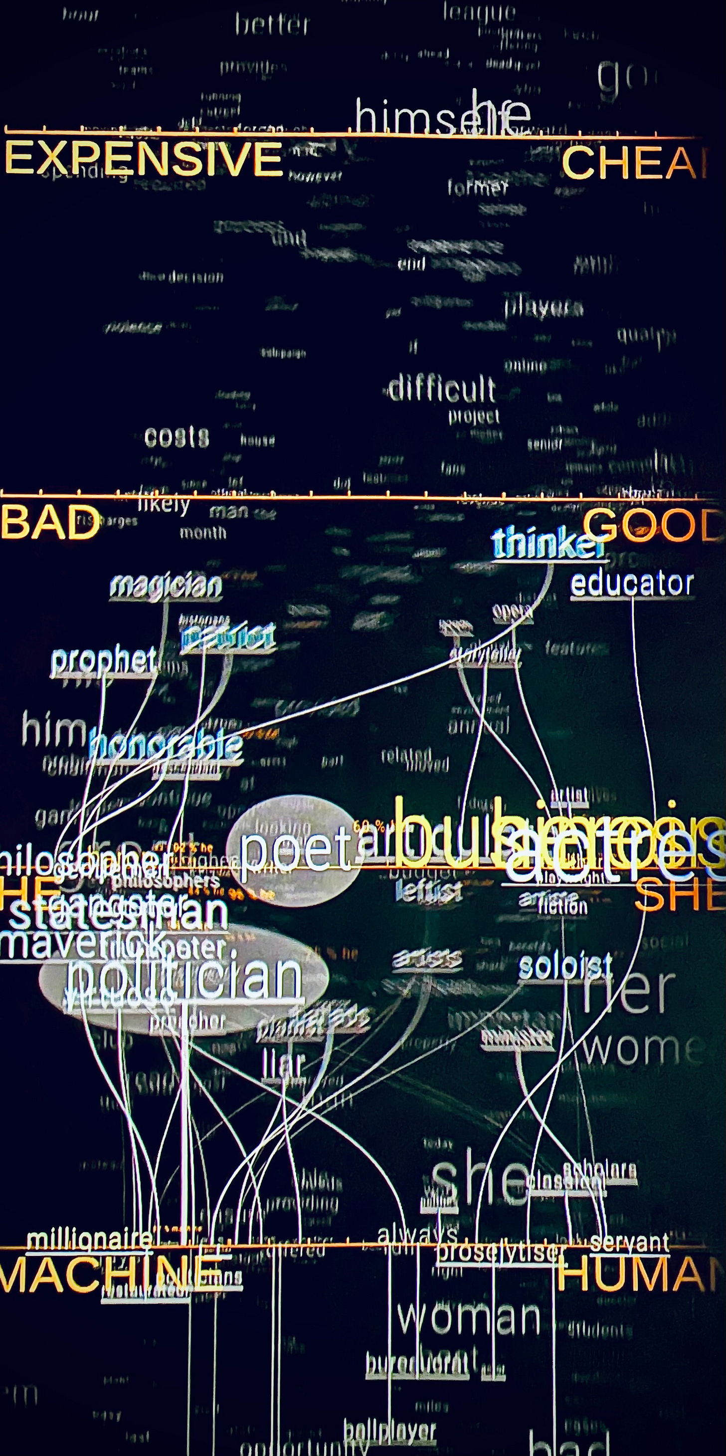 The groups of words in the waterfall show what the machine has learned and reflects how people use language. On the screen they flowed down and the images are screen shots. The input to the installation was me typing in a series of words, then the screen displayed how the program categorised and made sense of them as concepts, while its associations flowed down the screen.