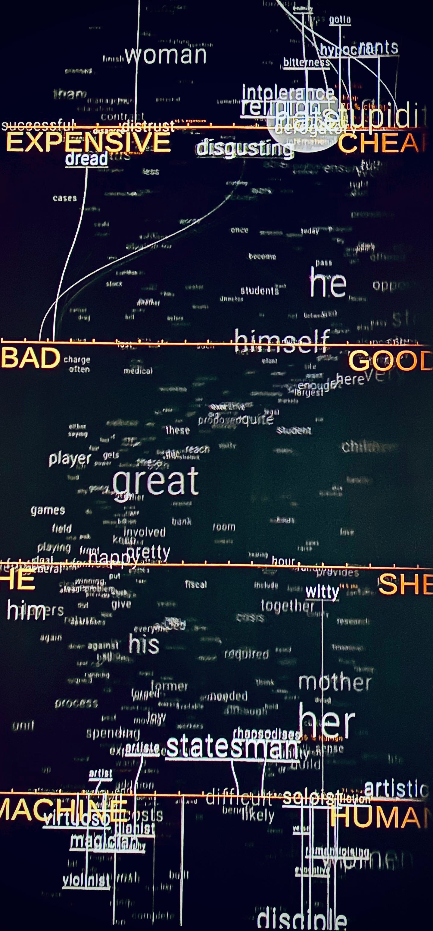 They are taken from an interactive video installation, ‘Waterfall of Words’, at the MACBA exhibition, which used technology called ‘Word Embedding’ to analyse millions of sentences and map words’ meaning based on their use.